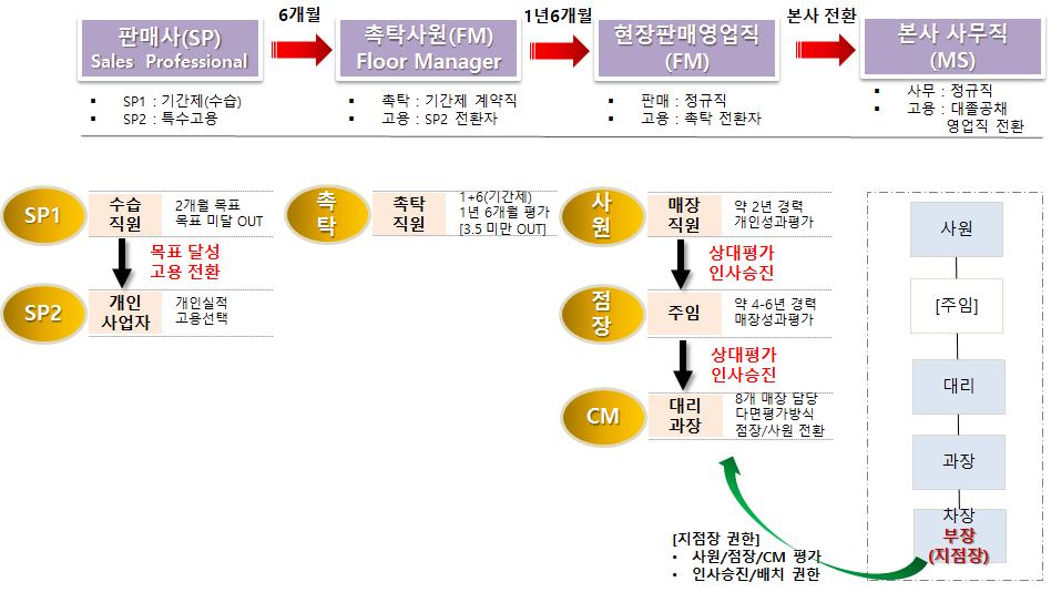 현장에서 고졸이나 전문직으로 출발한 SP가 본사 사무직(차부장)으로까지 승진한다는 것은 좀처럼 쉽지 않다. 각 매장 판매직의 결재권한은 본사 사무직(부장)에게 있으며, 매장 배치부터 인사승진까지 절대적인 영향력을 행사한다. 권역별 주요 매장을 관리·담당하는 슈퍼바이저(SM)의 주 업무는 매장 및 실적 관리 등이다. 각 매장의 일상적인 업무와 지시감독은 점장을 통해서 이루어지고 있으나, 점장에게 인사승진의 권한이 주어지지는 않는다.
