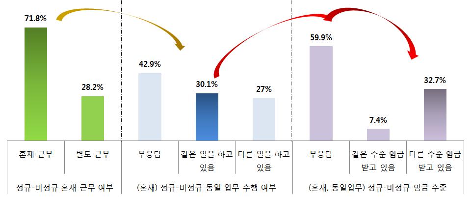 이동통신 3사 직영매장 판매직의 임금은 △기본급(최저임금 전후)과 △성과급(인센티브)으로 구성된다. B사 매장 판매직의 내부 임금구성 항목을 보면, 노동시간과 임금을 통한 노동자 통제 방식이 간접적으로 확인된다. B사 매장 판매직의 기본급 비중은 60~75%이며, 연장 휴일근로 수당 비중은 14~26%, 성과급 비중은 13~32%인데 성과급과 휴일근로 수당이 전체의 40∼50%를 차지하고 있다. 게다가 노동현장에서는 업무상의 차별(동일노동, 동일임금 미적용)도 발생한다. B사 매장에서 정규직과 같이 근무하는 판매직 비정규직의 비율은 71.8%로, 이 가운데 정규직과 동일 업무를 수행하는 비정규직 비율은 30.1%인데, 이 중 약 32.7%가 임금 차별을 받는다([그림2]).