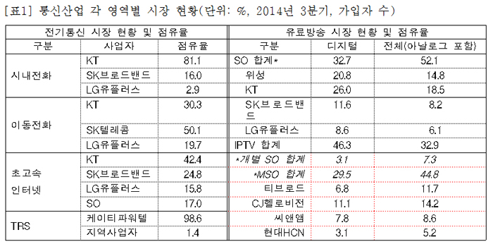 국내 통신산업 시장은 크게 ‘전기통신’과 ‘방송’으로 구분된다. 전기통신은 △시내전화, △이동전화, △초고속인터넷, △TRS(주파수공용통신)로 구분되고, 유료방송은 △SO(케이블TV 사업자), △IPTV로 구분된다. 통신산업에서 유료방송 일부를 제외하고는 이동통신 3사가 독과점 시장을 형성하고 있다. 시내전화는 KT(81.1%), 이동통신은 SK텔레콤(50.1%), 초고속 인터넷은 KT (42.4%)가 시장 내 점유율 1위를 차지하고 있다([표1]).