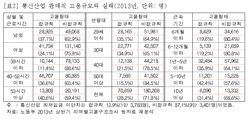 문제는 현재 이동통신 3사의 대리점이나 판매점 소속 종사자 대부분이 통신사 소속이 아닌 협력업체, 개인 점주 등에 속한 직원 혹은 개인사업자 형태의 포괄적 비정규직이라는 점이다. 따라서 현재 통신산업 판매직의 정확한 규모는 파악되지 않는다. 2013년 기준 통신산업 판매직은 약 25만 명(남성 7만 7,993명, 여성 17만 2,874명) 정도로 추정된다. 이 중 비정규직은 약 72%(18만 명)정도이다. 판매직은 20대(8만 명)와 30대(6만 5천명)가 전체 판매직의 58% 정도를 차지하고 있는데, 저임금(최저임금 미만 42.8%)과 장시간(52시간 이상 18.8%) 노동 때문에 이직률이 높아 근속기간(1년 미만 27.9%)은 매우 짧다([표2]). 그나마 통신 후발 주자인 LG유플러스는 판매 가입자 수를 늘리기 위해 직영매장 비중이 상대적으로 높다. 따라서 LG유플러스 판매 매장에는 본사와 고용관계를 형성한 정규직과 기간제 등의 고용형태가 존재한다.