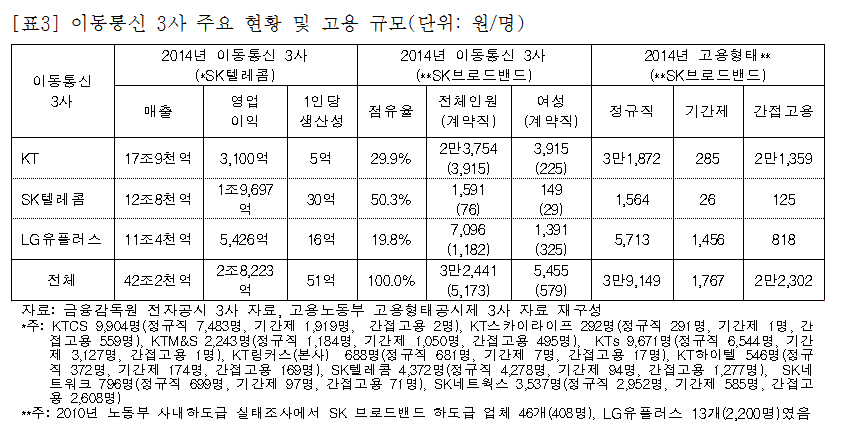 [표3]에서 알 수 있듯이 현재 이동통신 3사의 직접고용 인력은 4만 1천명 정도이며, 간접고용 2만 2천명을 포함할 경우 총 6만 3천명 정도 된다. 그러나 여기에는 네트워크 서비스(협력업체 A/S 및 설치기사)와 위탁 및 가맹 판매 서비스(대리점, 플라자, 마트 등) 인력은 포함되지 않는다. 현재 SK브로드밴드와 LG유플러스 소속 간접고용 노동자들은 각 사의 초고속 인터넷 및 유료방송 A/S·설치 업무를 담당하고 있다. 이동통신 3사의 CS, 콜센터 등 간접고용 인력을 포함할 경우 그 규모는 전체 통신산업의 2/3가 넘을 것으로 추정된다.
