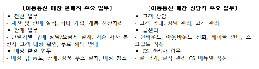 매장 판매직 업무는 △판매업무, △전산업무, △ 매장 환경 조성업무로 구분되며, 주요 업무는 △단말기별 구매 상담·요금제 설계, △기존 자사 통신사 고객 대상 할인·무료 혜택 안내 등이다.