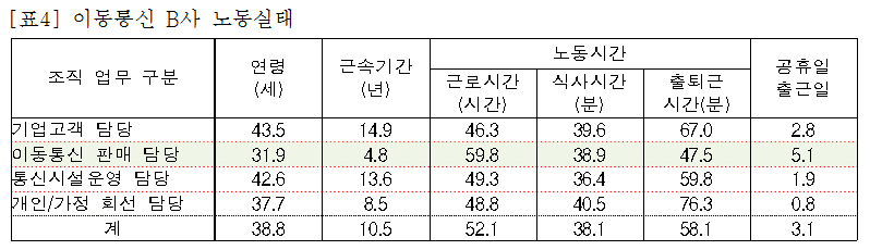이동통신 매장은 업무 특성상 거의 1년 내내 운영된다. 통상 이동통신 3사 매장은 오전 10시 혹은 10시 30분에 영업을 시작하며, 오후 10시(혹은 10시 30분)에 마감한다. 따라서 매장 판매직의 출근 시간은 대략 오전 9시나 9시 30분 정도다. [표4]에 따르면 매장 판매직(평균 연령 32세)의 평균 근속기간은 4.8년에 불과한데, 이는 장시간 노동 때문이다. B사의 전체 노동자 평균 노동시간은 주당 52시간 남짓인데, 매장 판매직은 59.8시간(휴게시간 39분 제외)이다. 매장 판매직 대부분이 인력 부족으로 주6일 근무(월 5회 휴일)를 하고 있기 때문이다.