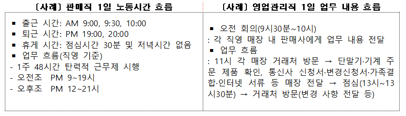 직영 매장은 ‘탄력 근무’ 제도를 시행하고 있다. 서비스업 특성상 고객이 가장 많이 방문하는 낮 동안 인력을 상대적으로 많이 배치한다. 교대제 근무형태는 오전조(출근 9시)와 오후조(출근 12시)로 구분하며, 1주 근로시간은 48시간 정도다. 그럼에도 매장 판매직의 하루 노동시간 흐름을 보면, 휴게시간(60분) 중 점심시간은 39분 정도이며, 저녁 8시 이후 퇴근하는 것이 일상이지만 별도의 연장근로 수당이나 저녁시간·식대 등은 보장받지 못하고 있다.