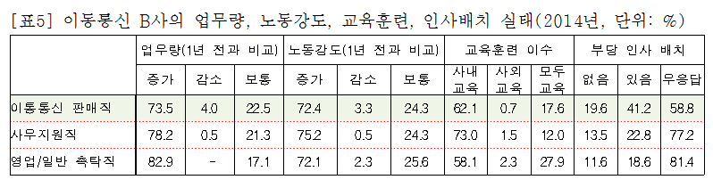 노동조건이 열악한 탓에 이동통신 매장 판매직의 이직률은 매우 높다. B사의 경우 이·퇴직으로 지난 1년 사이 약 1/3 정도의 인력이 감소한 것으로 나타났다. [표5]에서 알 수 있듯이, 지난 1년간 업무량이 증가했다는 의견은 약 73.5%였고, 노동강도가 강화되었다는 의견은 72.4%였다. 그 이유는 인력 부족으로 인한 장시간 노동 때문인데, 약 57.5%의 판매직이 “현재의 근무시간을 줄이고 싶다”고 답했다.