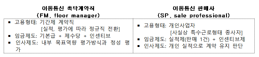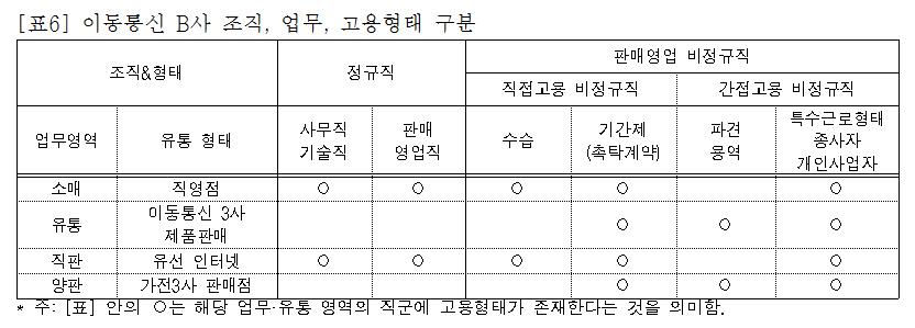 이동통신 3사별로 유통 운영형태와 조직구조(직영 매장, 비직영 매장)에 따라 고용구조(직접고용, 간접고용)는 상이하다. B사의 내부 조직구조는 통상 ‘판매영업직군’과 ‘사무관리직군’의 이원화된 형태를 갖고 있다. 판매영업직군 안에 ‘현장판매직군’을 두고 있으며 여기에는 판매사(SP), 촉탁계약직 사원(FM), 판매영업 사원)이 속한다. ‘사무관리직군’에는 사원, 대리, 과장, 차·부장 등 사무직원이 속한다. 이들은 ‘SP – 촉탁계약직FM – 현장판매영업직(FM) – 점장 – 중간관리자(CSM – RM – CM)’ 등의 인사 사다리로 연결되어 있다.