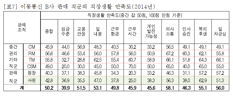 B사 매장 판매직이 직장생활에 만족하지 못하는 이유는 대부분 노동조건(노동시간, 임금)과 조직운영(인사승진, 고용구조)에서 찾을 수 있다. 특히 인력부족으로 인한 노동강도 강화(주6일 출근, 장시간 노동)와 성과주의 경영조직문화(과중한 업무 스트레스와 실적 압박)가 주요하다. 비단 B사 뿐만 아니라 각 이동통신사의 사업 채널 유형(직영-비직영), 최소 인력 정책과 고용형태(정규-비정규-특고), 365일 영업 형태(주6일 근무)는 거의 동일한 상황이다.