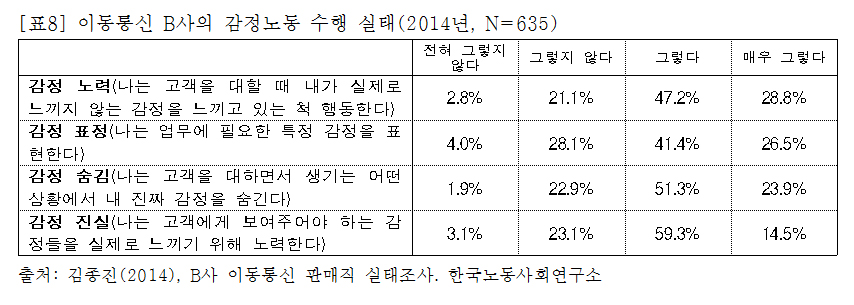 매장 판매직은 주된 애로사항의 하나로 ‘감정노동’ 문제를 꼽는다. 주 업무가 고객 상담과 판매이기에 고객에 대한 응대가 매우 중요한데, 판매직의 감정노동 정도는 [표8]에서 보는 바와 같이 ‘감정 노력’(76%), ‘감정 표정’(67.9%), ‘감정 숨김’(75.8%), ‘감정 진실’(73.8%) 항목 모두에서 높은 비율을 보이고 있다. 감정노동 관련 문제는 반말과 같은 고객으로부터의 인격 무시나 폭언 등이 대부분인데, 이는 대개 가입과 개통 관련 개인서류 작성 시 발생한다. 내부 직원들은 “회사 규정대로 업무를 수행했음에도, 무조건 사과를 해야 하고 결국 고객의 요구를 수용하게 될 때 자존감이 상실된다”고 하소연한다.
